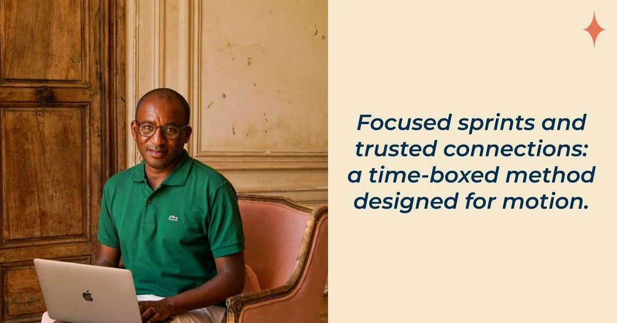 Focused sprints and trusted connections: a time-boxed method designed for motion. Expand your network. Learn from those who've been there. Create value for the world around us.